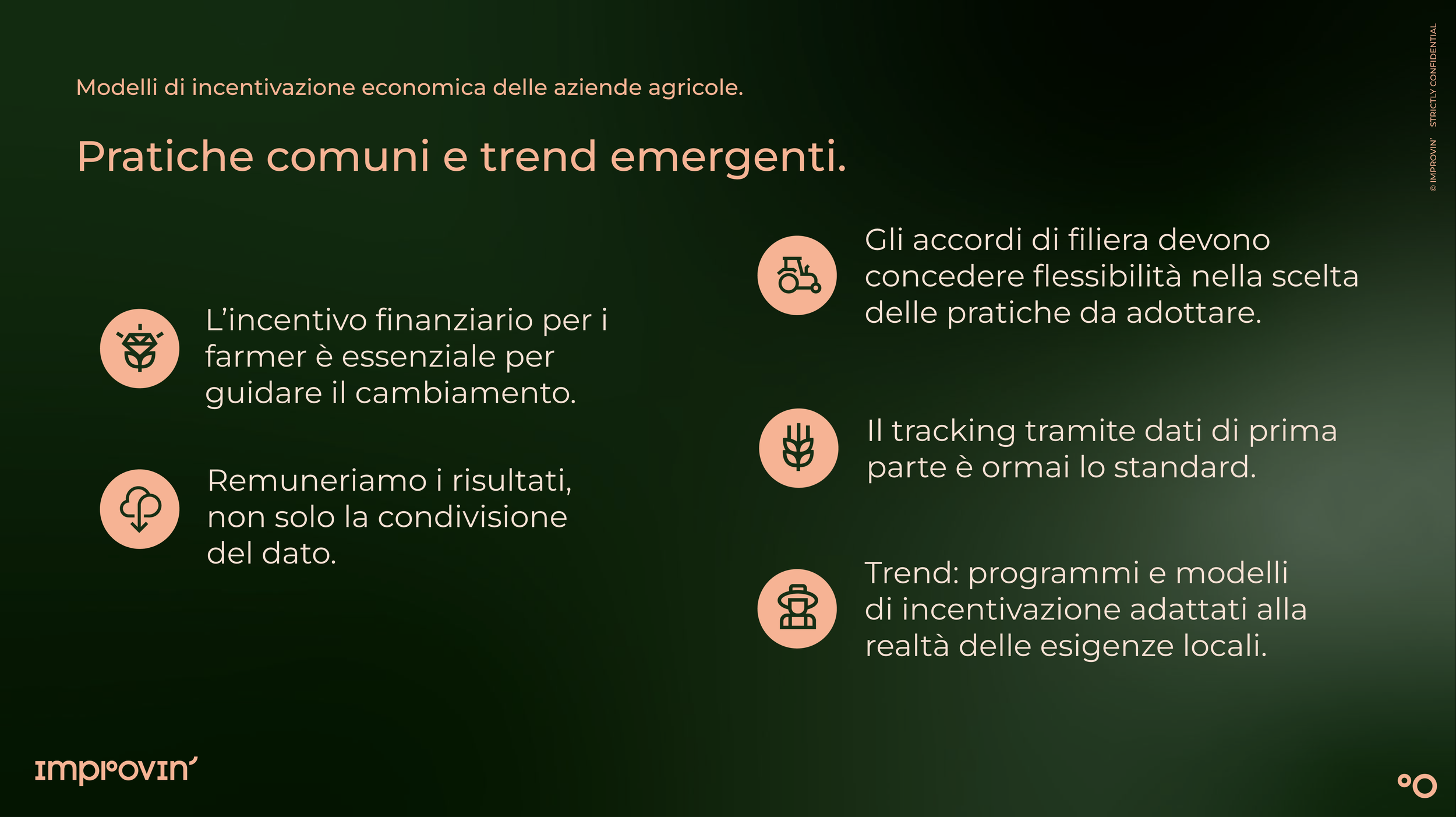 Il Sustainability Operating System di Improvin’ fornisce l'infrastruttura necessaria per il lancio di programmi di questo tipo, il monitoraggio dei risultati con dati primari, il coinvolgimento e la ricompensa degli agricoltori, oltre ovviamente alla commercializzazione dei risultati.